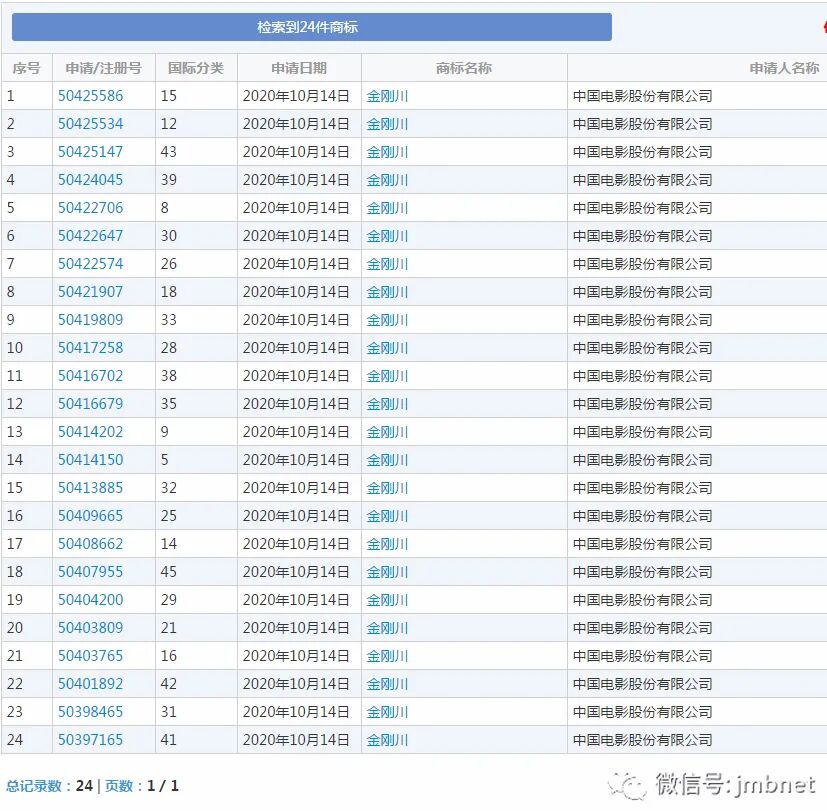 据了解,《金刚川》于10月23日上映,该电影出品方中国电影股份有限公司在2020年10月14日提交申请了24件“金刚川”商标,目前商标状态均为注册申请中。