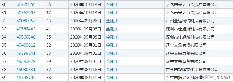 除此之外,还有6家公司申请了10个“金刚川”相关商标,这些商标的申请时间均早于2020年10月14日。其中有5个商标注册的类别和中国电影股份有限公司注册的商标类别重合。