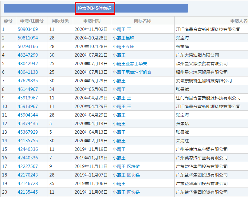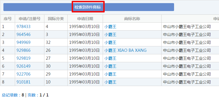 经过一番搜索发现中国商标网目前共有345件“小霸王”相关的商标申请,其中小霸王的主体公司中山市小霸王电子工业公司共提交8件“小霸王”有关商标。这8件商标因为没有如期做商标续展,已全部被注销,商标已无效。