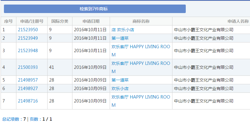 2016年中山市小霸王文化产业有限公司申请过7件商标,分别注册在第9类、28类和41类上,目前有4件商标已成功注册。