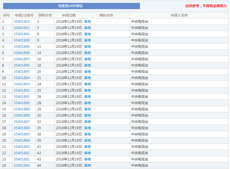 在2018年12月19日,官方终于行动了,中央电视台一口气申请注册了24件“春晚”商标、24件“CCTV春晚"商标、24件“央视春晚”商标、24件“中央电视台春节联欢晚会”商标、24件“春节联欢晚会”商标,总计120件商标。