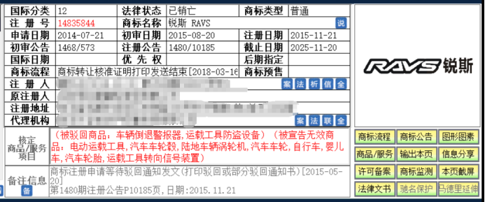 4、锐斯商标于14年申请,15年注册成功,后因版权问题,被他人提出无效宣告申请,因争议商标的注册已经损害了他人享有的在先著作权,已构成《商标法》第三十二条规定“不得损害他人现有的在先权利”之情形,终被无效。