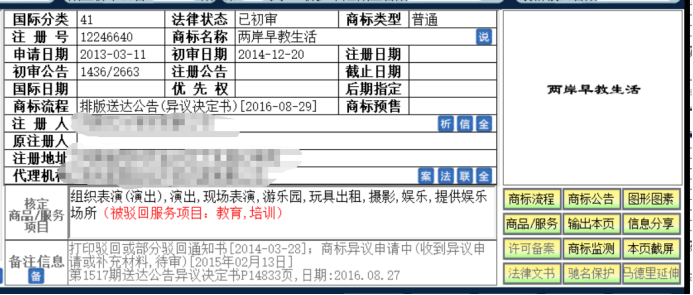 2、两岸早教生活商标,13年申请,14年初审,最后因他人版权在先为由,在公告期内被异议,最终无效。