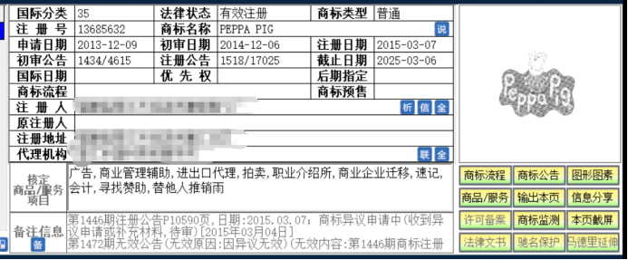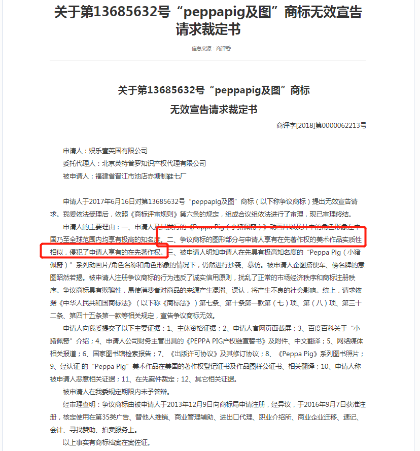 3、第“13685632”号商标,在经别人异议申请不成立,于2016年9月7日获准注册,(即异议不成立),后来对方提出争议商标的图形部分与申请人享有在先著作权的美术作品实质性相似,侵犯了申请人享有的在先著作权,最终争议商标被宣告无效。