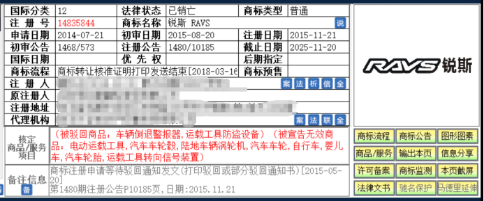 4、锐斯商标于14年申请,15年注册成功,后因版权问题,被他人提出无效宣告申请,因争议商标的注册已经损害了他人享有的在先著作权,已构成《商标法》第三十二条规定“不得损害他人现有的在先权利”之情形。终被无效。