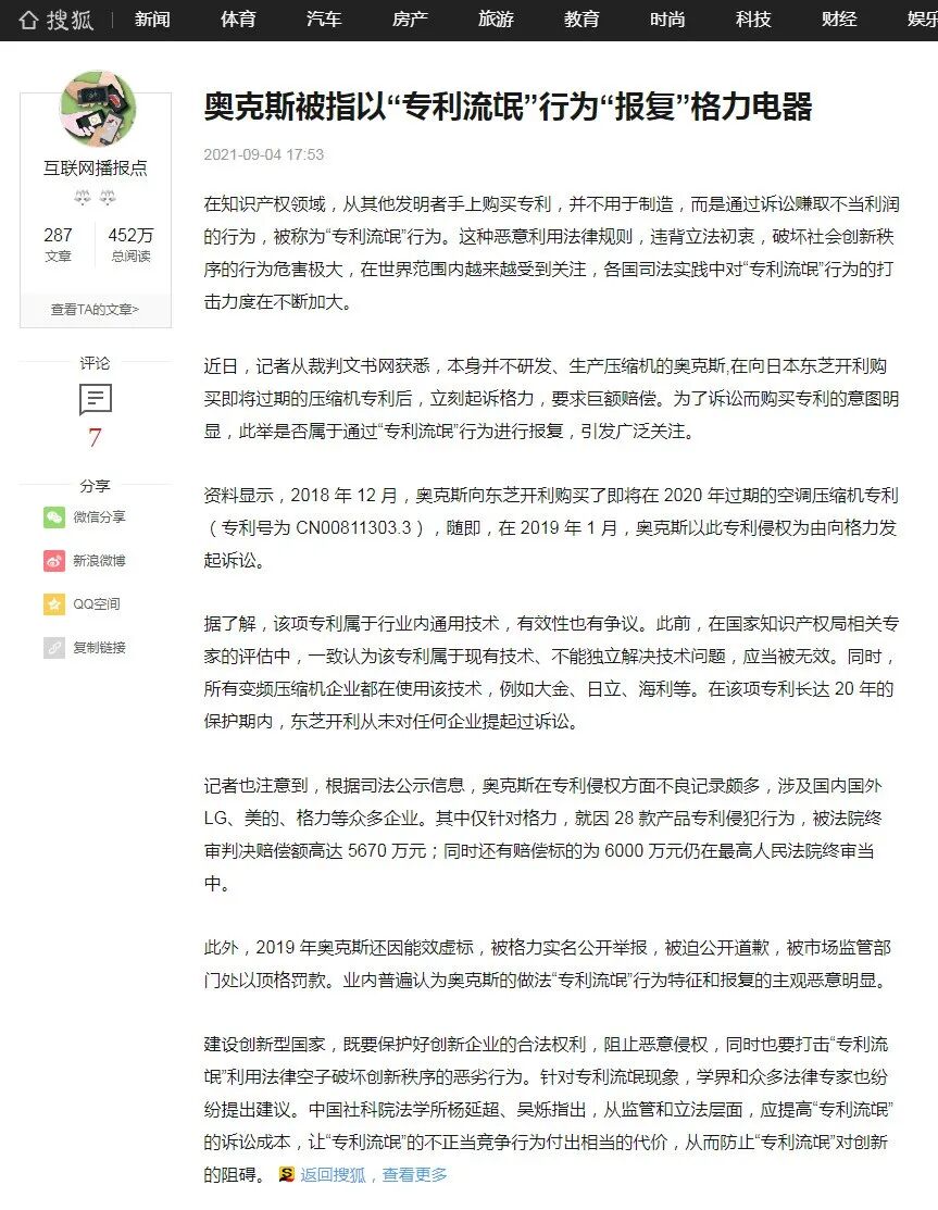 “近日,记者从裁判文书网获悉,本身并不研发、生产压缩机的奥克斯,在向日本东芝开利购买即将过期的压缩机专利后,立刻起诉格力,要求巨额赔偿。为了诉讼而购买专利的意图明显,此举是否属于通过“专利流氓”行为进行报复,引发广泛关注。”