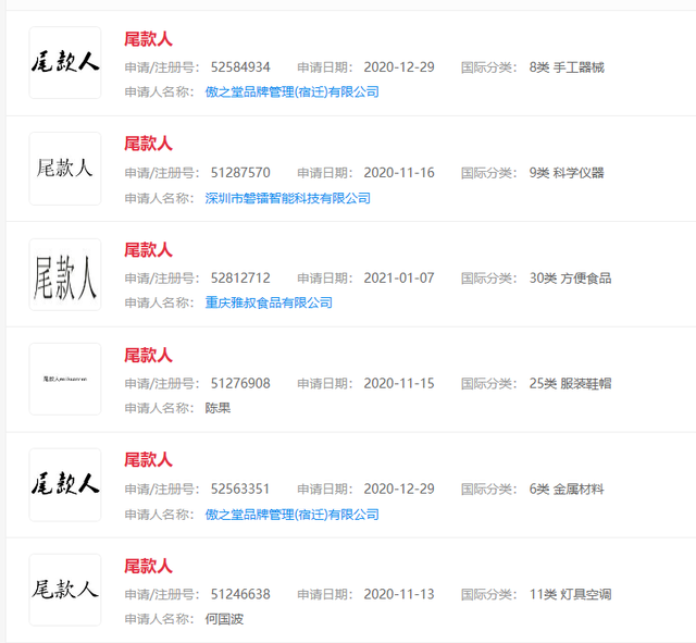 尾款人商标目前已被多方抢注,国际分类涉服装鞋帽、方便食品等,申请日期多为2020年,目前尾款人相关商标共计22个。