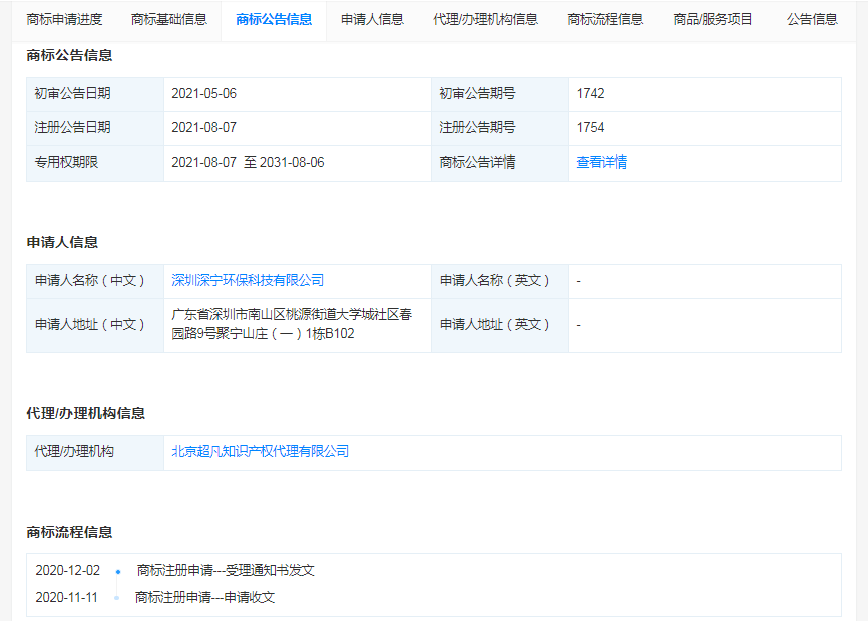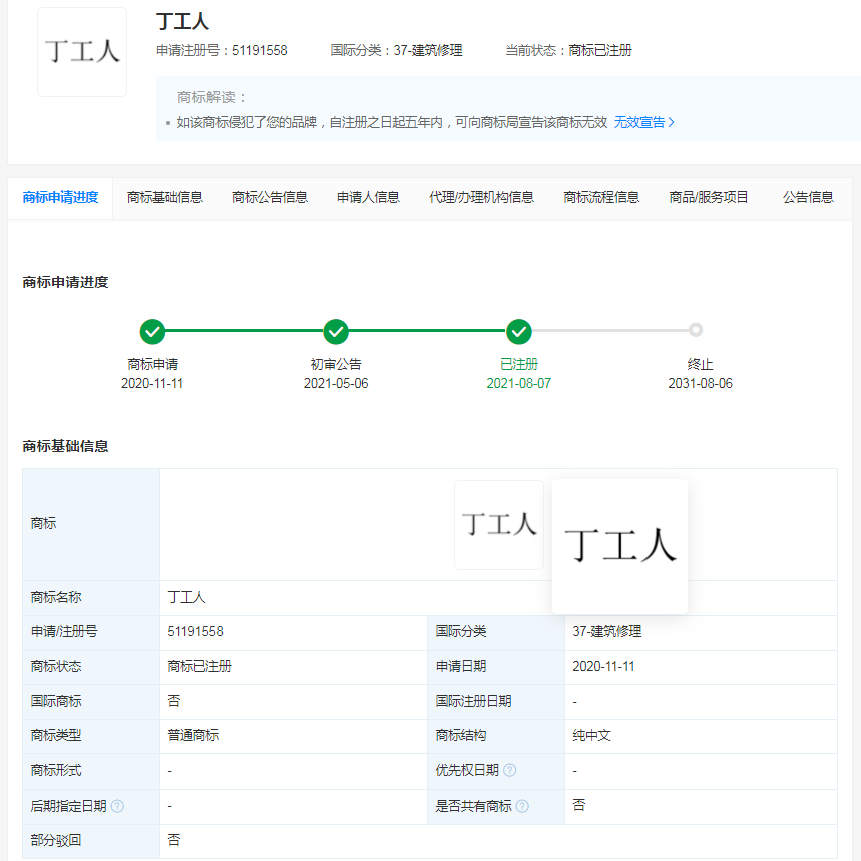 近期,名称为“丁工人”的商标已完成注册,该商标申请于2020年11月11日,国际分类为建筑修理,申请人为深圳深宁环保科技有限公司。