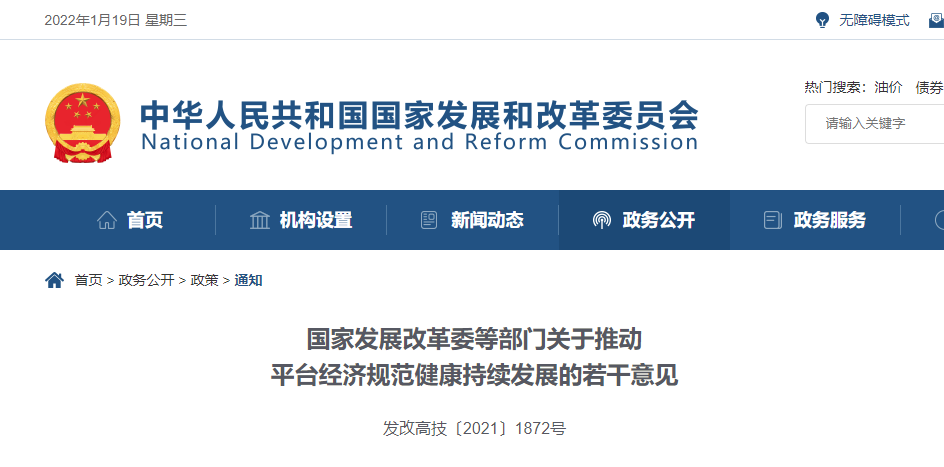 近日,国家发展改革委等九部门联合下发关于推动平台经济规范健康持续发展的若干意见。1月19日,国家发展改革委网站发布了国家发展改革委负责同志就《关于推动平台经济规范健康持续发展的若干意见》答记者问。