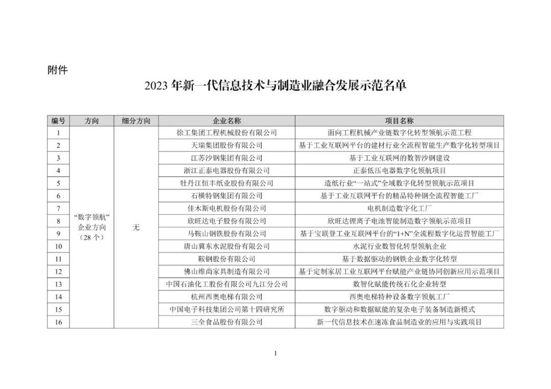 关于2023年新一代信息技术与制造业融合发展示范名单的公示